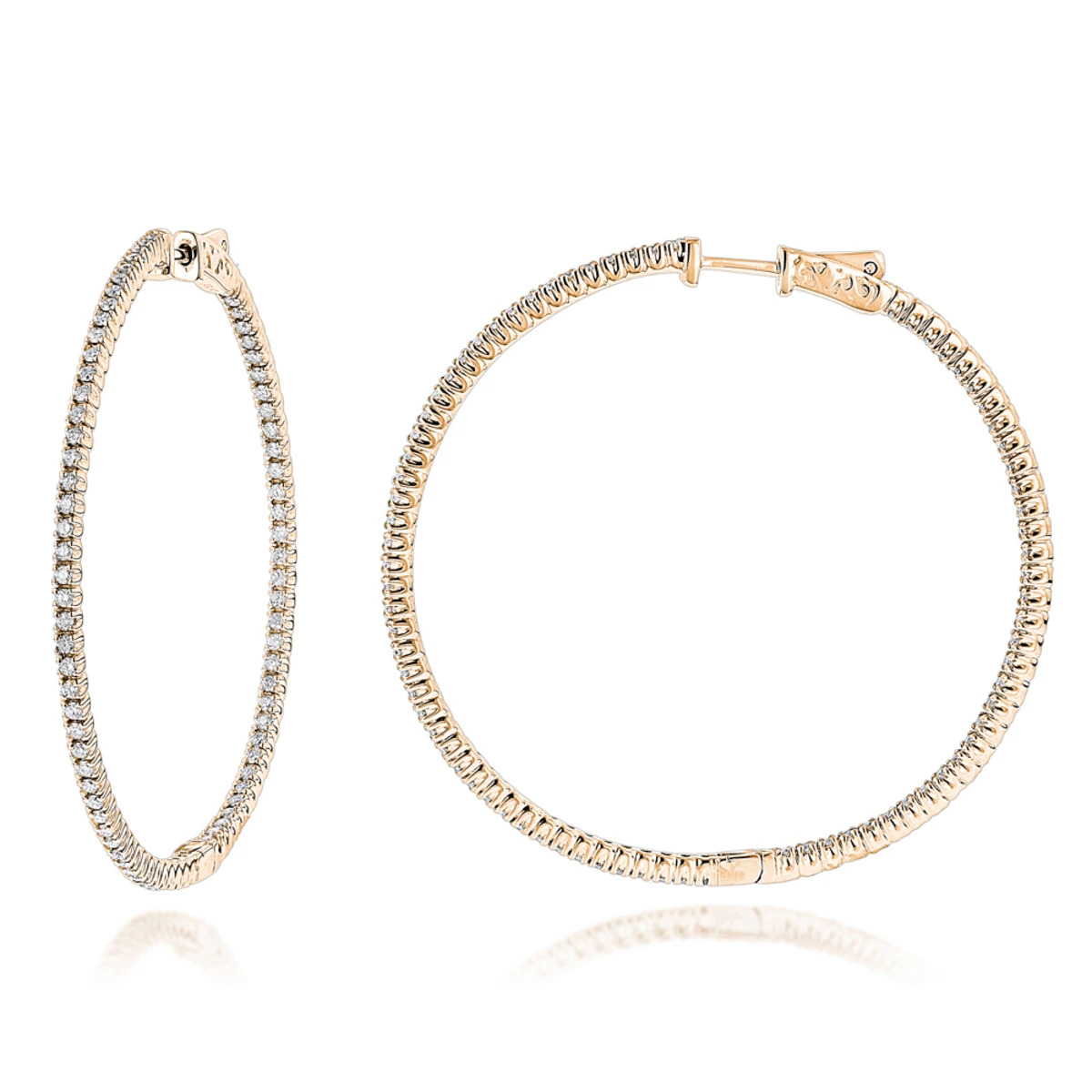 These 14K Gold 2 inch Inside Out Diamond Hoop Earrings showcase 1.6 carats of sparkling round diamonds, each masterfully prong set in luscious 14K gold. Featuring a luxurious inside out design, a highly polished gold finish, and secure lock closures, these fantastic diamond hoop earrings are available in 14K white, yellow and rose gold.
