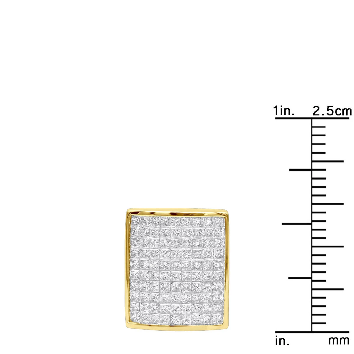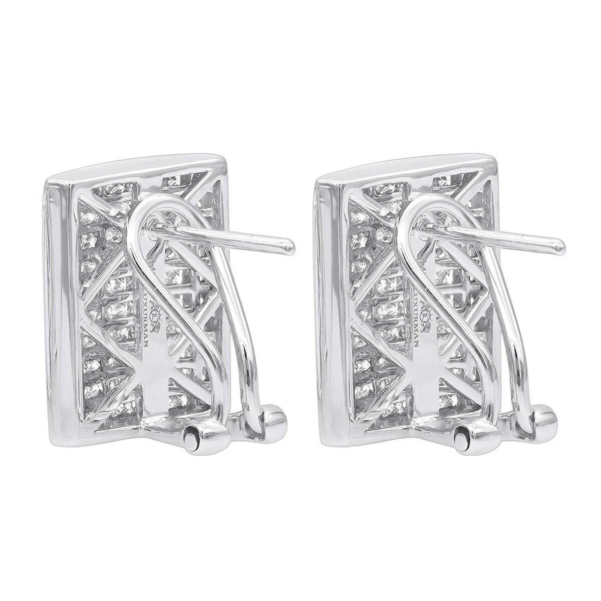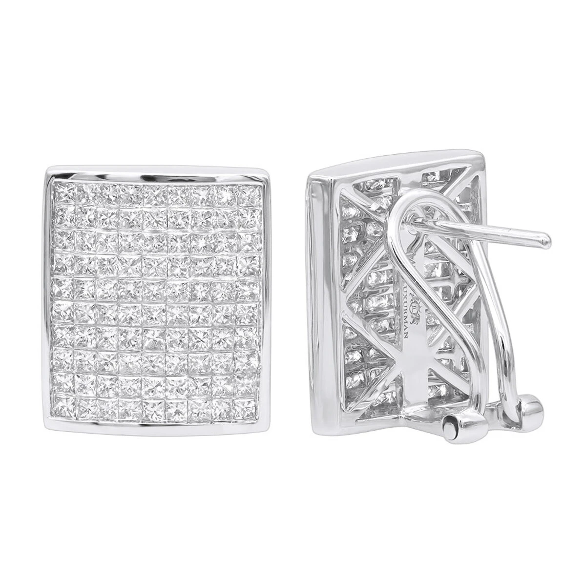 These Designer Diamond Earrings in 14K gold weigh approximately 8 grams and showcase 2.94 carats of dazzling princess cut invisibly-set diamonds. Featuring a luxurious design and a highly polished gold finish, these designer diamond earrings are available in 14K white, yellow and rose gold.