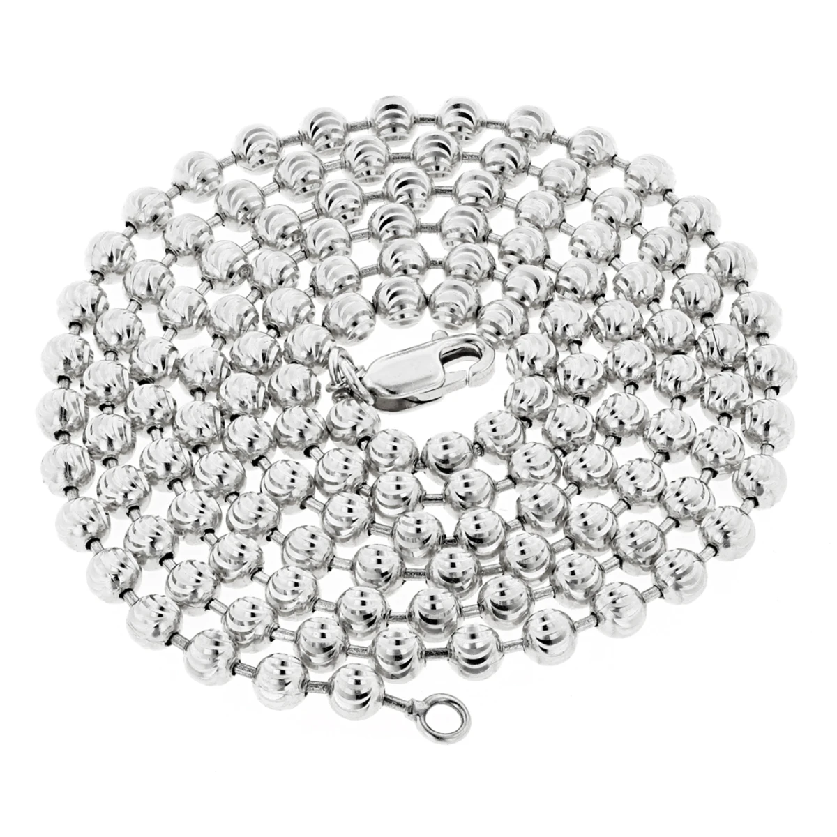 This Men’s 14K White Gold Moon Cut Bead Chain is presented in lustrous 14K gold topped off with a professional bright polish. This 14K gold shiny bead chain for men is 5mm wide, 22 in long and is available in 14K white gold or yellow gold and in different chain lengths.