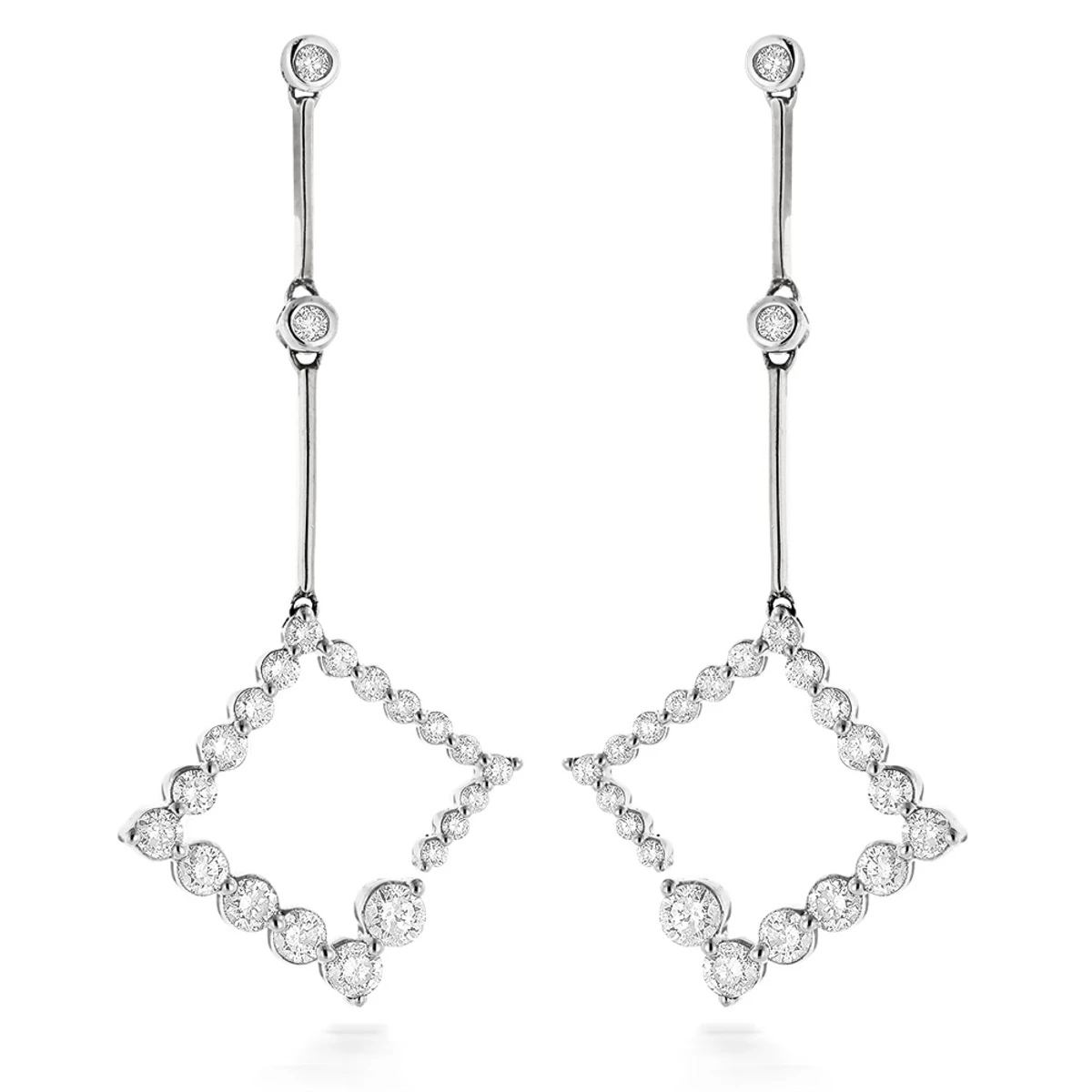 These exquisite 14K Two Tone Gold Journey Diamond Earrings with 1 carat of graduating round diamonds weigh approximately 3 grams and showcase an elegant dangling chandelier design. Featuring one full carat of sparkling bar and bezel set round diamonds, these fabulous women’s diamond earrings are available in 14K white, yellow and rose gold.